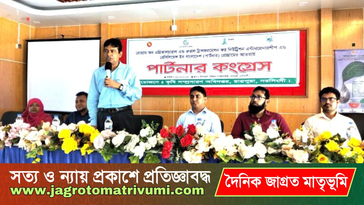 নরসিংদীর রায়পুরা উপজেলা কৃষকদের দক্ষতা ও সচেতনতা বৃদ্ধির লক্ষ্যে দিনব্যাপী পার্টনার কংগ্রেস অনুষ্ঠিত হয়েছে। শনিবার(২৪মে)উপজেলা পরিষদ মিলনায়তনে “প্রোগ্রাম অন এগ্রিকালচারাল অ্যান্ড রুরাল ট্রান্সফরমেশন ফর নিউট্রিশন,এন্টারপ্রেনারশিপ অ্যান্ড রেজিলিয়েন্স ইন বাংলাদেশ(পার্টনার)প্রকল্পের আওতায় কৃষি সম্প্রসারণ অধিদপ্তর এই আয়োজন করে।অনুষ্ঠানে উপজেলা নির্বাহী কর্মকর্তা মো মাসুদ রানা’র সভাপতিত্বে প্রধান অতিথি হিসেবে উপস্থিত থেকে বক্তব্য রাখেন নরসিংদী জেলার কৃষি সম্প্রসারণ অধিদপ্তরের উপ-পরিচালক কৃষিবিদ মুহাম্মদ আব্দুল হাই।বিশেষ অতিথি হিসেবে উপস্থিত ছিলেন অতিরিক্ত উপ-পরিচালক কৃষিবিদ জামাল হোসেন, উপজেলা কৃষিবিদ মোস্তাফিজুর রহমান,কৃষি সম্প্রসারণ অফিসার মো:সোহেল রানা,উপজেলা সমবায় অফিসার রৌশনারা বেগম, সমাজ সেবা অফিসার খলিলুর রহমানসহ উপ-সহকারী কৃষি কর্মকর্তাগণ।এতে উপজেলা ২৪টি ইউনিয়ন ও১টি পৌরসভা হতে পিএফএস ও নন-পিএফএস সদস্য, জনপ্রতিনিধি,গনমাধ্যমকর্মী, গন্যমান্য ব্যক্তিবর্গসহ মোট ১০০জন কংগ্রেসে অংশগ্রহণ করেন।সভায় কৃষি কর্মকর্তা মোস্তাফিজুর রানা জানান,উপজেলার কৃষকদের উন্নত প্রযুক্তি ও জ্ঞানভিত্তিক চাষাবাদের উদ্বুদ্ধ করতে ইতোমধ্যে ৩৫টি কৃষক পার্টনার স্কুল গঠন করা হয়েছে। প্রতিটি স্কুলে রয়েছে ২৫জন করে কৃষক সদস্য। এসব স্কুলে কৃষকদের মাঝে উত্তর কৃষি চর্চা, ফল, ফল ও সবজি উৎপাদনে মানদণ্ড নির্ধারণ ও বাস্তবায়ন,উচ্চ ফলনশীল ধানের জাত উন্নয়ন এবং কৃষি উদ্যোক্তা তৈরির বিষয়ে প্রশুক্ষণ দেওয়া হচ্ছে।