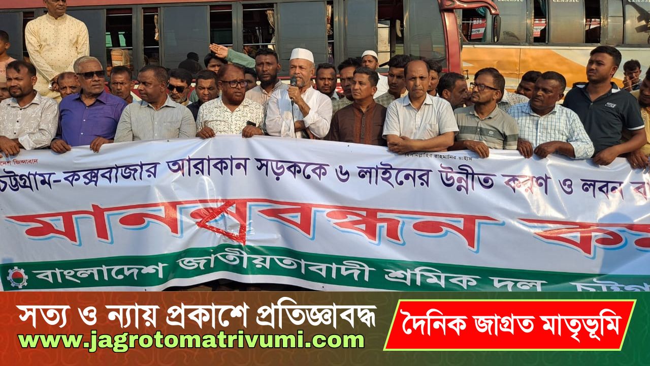 দক্ষিন চট্টগ্রামের আরাকান সড়ক কে ৬ লেইনে উন্নীতকরণ এবং লবনবাহি গাড়ী চলাচলে ট্রাফিক নিয়ম কার্যকর করার দাবিতে চট্টগ্রাম দক্ষিণ জেলা শ্রমিক দলের মানব বন্ধন ও সমাবেশ আজ ০৭ এপ্রিল সোমবার বিকাল তিনটায় চট্টগ্রাম শাহ আমানত সেতু সংলগ্ন রাস্তায় চট্টগ্রাম দক্ষিণ জেলা শ্রমিক দলের এক বিশাল মানবন্ধন কর্মসূচী চট্টগ্রাম দক্ষিণ জেলা শ্রমিক দলের সভাপতি ও চট্টগ্রাম বিভাগীয় শ্রমিক দলের সহ-সভাপতি শফিকুল ইসলাম চেয়ারম্যানের সভাপতিত্বে এবং দক্ষিণ জেলা শ্রমিক দল সাধারণ সম্পাদক বীর মুক্তিযোদ্ধা মহসিন খান তরুণ এর সঞ্চালনায় অনুষ্ঠিত হয়। উক্ত মানব বন্ধন ও সমাবেশে প্রধান অতিথি ছিলেন বিএনপির শ্রমিক বিষয়ক সম্পাদক ও বিভাগীয় শ্রমিক দল সভাপতি বীর মুক্তিযোদ্ধা এ এম নাজিম উদ্দীন,বিশেষ অথিতি চট্টগ্রাম বিভাগীয় শ্রমিক দল সিঃ যুগ্ম সম্পাদক মোঃ আবদুল বাতেন, সাংগঠনিক সম্পাদক মোঃ রফিক, বিভাগীয় শিক্ষা ও গবেষণা সম্পাদক এডভোকেট মোঃ ইকবাল হোসেন, দক্ষিণ জেলা সিঃ সহ-সভাপতি পরিবহন শ্রমিক নেতা নুরুল কবির,, এতে দক্ষিণ জেলা আওতাধীন বিভিন্ন উপজেলার শ্রমিক দল সভাপতি -সাধারণ সম্পাদক, পৌরসভার সভাপতি -সাধারণ সম্পাদক, এবং চট্টগ্রাম দক্ষিণ জেলা কমিটির নেতৃবৃন্দ।। বক্তারা অবিলব্মে আরাকান সড়ক কে ৬ লেইনে উন্নীত করার জোর দাবি জানান, লবনবাহি গাড়ি চলাচলে ট্রাফিক আইন কার্যকর করার আহবান করেন।
