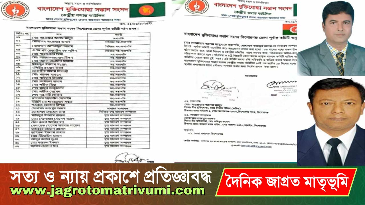 অরাজনৈতিক ও মানবসেবায় নিয়োজিত বাংলাদেশ মুক্তিযোদ্ধা সন্তান সংসদের কিশোরগঞ্জ জেলা পূর্নাঙ্গ কমিটি অনুমোদন দেওয়া হয়েছে। মোঃ সারোয়ার আলম মাসুদকে সভাপতি ও মোঃ নাজমুল আলমকে সাধারণ সম্পাদক করে ১৪১ সদস্যবিশিষ্ট কমিটি অনুমোদন দিয়েছে বাংলাদেশ মুক্তিযোদ্ধা সন্তান সংসদের কেন্দ্রীয় কমিটি। কেন্দ্রীয় কমিটির চেয়ারম্যান মোঃ সোলায়মান মিয়া ও মহাসচিব শফিকুল ইসলাম বাবুর স্বাক্ষরিত কমিটি অনুমোদন পত্রে আরও বলা হয় আগামী তিন মাসের মধ্যে সকল উপজেলার পূর্ন কমিটি গঠন করতে হবে, ঢাকা বিভাগ ও কেন্দ্রীয় কমিটির সাথে সমন্বয় করে, গঠনতন্ত্রের আইন-কানুন মেনে সংগঠন পরিচালনা করতে হবে। এছাড়াও আরও উল্লেখ করা হয়, গঠনতন্ত্র ও রাষ্ট্রবিরোধী কোন কাজে জড়িত থাকলে উক্ত কমিটি বাতিল বলে ঘোষণা করা হবে। কমিটি অনুমোদন পত্রে বলা হয় উক্ত কমিটির মেয়াদকাল দুই বছর।তাছাড়া কমিটির সদস্যবৃদ্ধি ও বাতিল করার সকল ক্ষমতা সংরক্ষণ করে বাংলাদেশ মুক্তিযোদ্ধা সন্তান সংসদ কেন্দ্রীয় কমান্ড কাউন্সিল। উক্ত পত্র জারির ১৫ দিনের মধ্যে পরিচিত সভা ও স্থানীয় প্রশাসনের সাথে সৌজন্য সাক্ষাৎ করার জন্য নির্দেশ প্রদান করা হয়।উক্ত কমিটি অনুমোদন অনুষ্ঠানে উপস্থিত ছিলেন বাংলাদেশ মুক্তিযোদ্ধা সন্তান সংসদের কেন্দ্রীয় কমিটির চেয়ারম্যান মোঃ সোলায়মান মিয়া ও মহাসচিব শফিকুল ইসলাম বাবু। এছাড়াও আরোও উপস্থিত ছিলেন, বাংলাদেশ মুক্তিযোদ্ধা সন্তান সংসদের কেন্দ্রীয় কমিটির ভাইস চেয়ারম্যান,মোঃ জুয়েল মিয়া, আলহাজ্ব আলমগীর কবির সোহাগ, কেন্দ্রীয় কমিটির যুগ্ম মহাসচিব, মোঃ ইলিয়াস মাহমুদ, (কেন্দ্রীয় কমিটির সাংগঠনিক সম্পাদক) মোঃ শের আলী কেন্দ্রীয় কমিটির সাংগঠনিক সম্পাদক, সেলিম রেজা, যুগ্ম সাধারণ সম্পাদক,মুন্নি, নির্বাহী সদস্য বাংলাদেশ মুক্তিযোদ্ধা সন্তান সংসদ কেন্দ্রীয় কমিটিসহ বিভিন্ন নেতৃবৃন্দ। অনুষ্ঠানে মোঃ সোলায়মান মিয়া তার বক্তব্যে বলেন, বিগত বছরের সকল ভেদাভেদ ভুলে মুক্তিযোদ্ধা পরিবারের ঐক্যবদ্ধ হতে হবে। মুক্তিযোদ্ধা পরিবারের ঐক্যবদ্ধ ছাড়া এদেশে মুক্তিযোদ্ধা পরিবার সুরক্ষা সম্ভব নয়। তিনি আরো বলেন বিগত বছরে কিশোরগঞ্জ জেলা মুক্তিযোদ্ধা সন্তান সংসদ কিশোরগঞ্জের মুক্তিযোদ্ধা পরিবারের পাশে থেকে অনেক কাজ করেছেন। তবে সেই কাজের জন্য কিশোরগঞ্জ জেলার মুক্তিযোদ্ধা সন্তান সংসদের সকল নেতৃবৃন্দের অবদান ছিলো অপরিসীম। মোঃ সারোয়ার আলম মাসুদ এবং মোঃ নাজমুল আলমকে এর কঠোর পরিশ্রম ও মেধার প্রাধান্য দিয়ে বাংলাদেশ মুক্তিযোদ্ধা সন্তান সংসদ কেন্দ্রীয়ভাবে সিদ্ধান্ত গ্রহণ করে তাদের সভাপতি ও সাধারণ সম্পাদক করার। মোঃ শফিকুল ইসলাম বাবু বলেন, আমরা কেন্দ্রীয় কমিটি আশা করি, সভাপতি ও