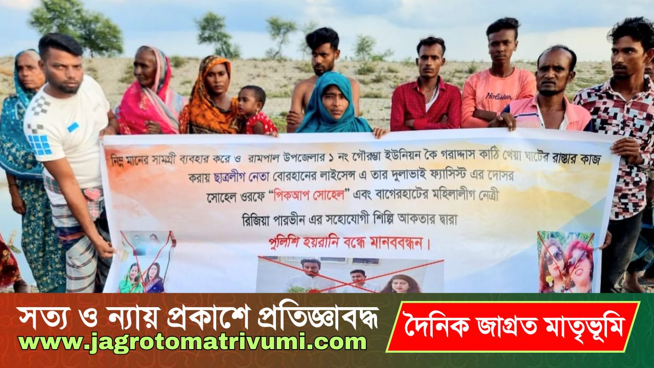 বাগেরহাটের রামপালের কৈগর্দাসকাঠি খেয়াঘাট সংলগ্ন সড়ক নির্মাণে অনিয়ম ও পুলিশি হয়রানির অভিযোগে মানববন্ধন করা হয়েছে। শনিবার (৪ মে) বিকাল ৫ টায় উপজেলার কৈগর্দাসকাটি গ্রামে এ মানববন্ধন করেছেন গ্রামবাসী। এ সময় দুই শতাধিক গ্রামবাসী মানববন্ধনে উপস্থিত ছিলেন।
